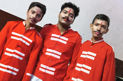 Boys: Red checked trousers, red full-sleeve shirt, red jacket. Black Shoe Red Socks Tie Belt